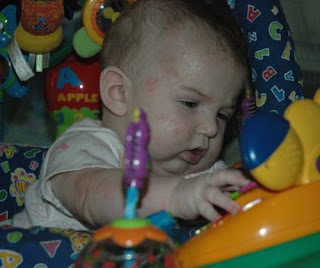 I know I've been busy playing with my friends and cutting a second tooth. That's right. I now have two bottom teeth. Yay me! I also had my 6 month check up on Aug 4th. I only grew a half inch, I'm now 28 inches and gained a little over a pound. I'm now 17 lbs 10 oz. I did great with my shots. I cried of course when I got them. They hurt!! But Mommy held me for a little bit and then I was okay. Still doing well, and now eating some more formula and cereal twice a day.